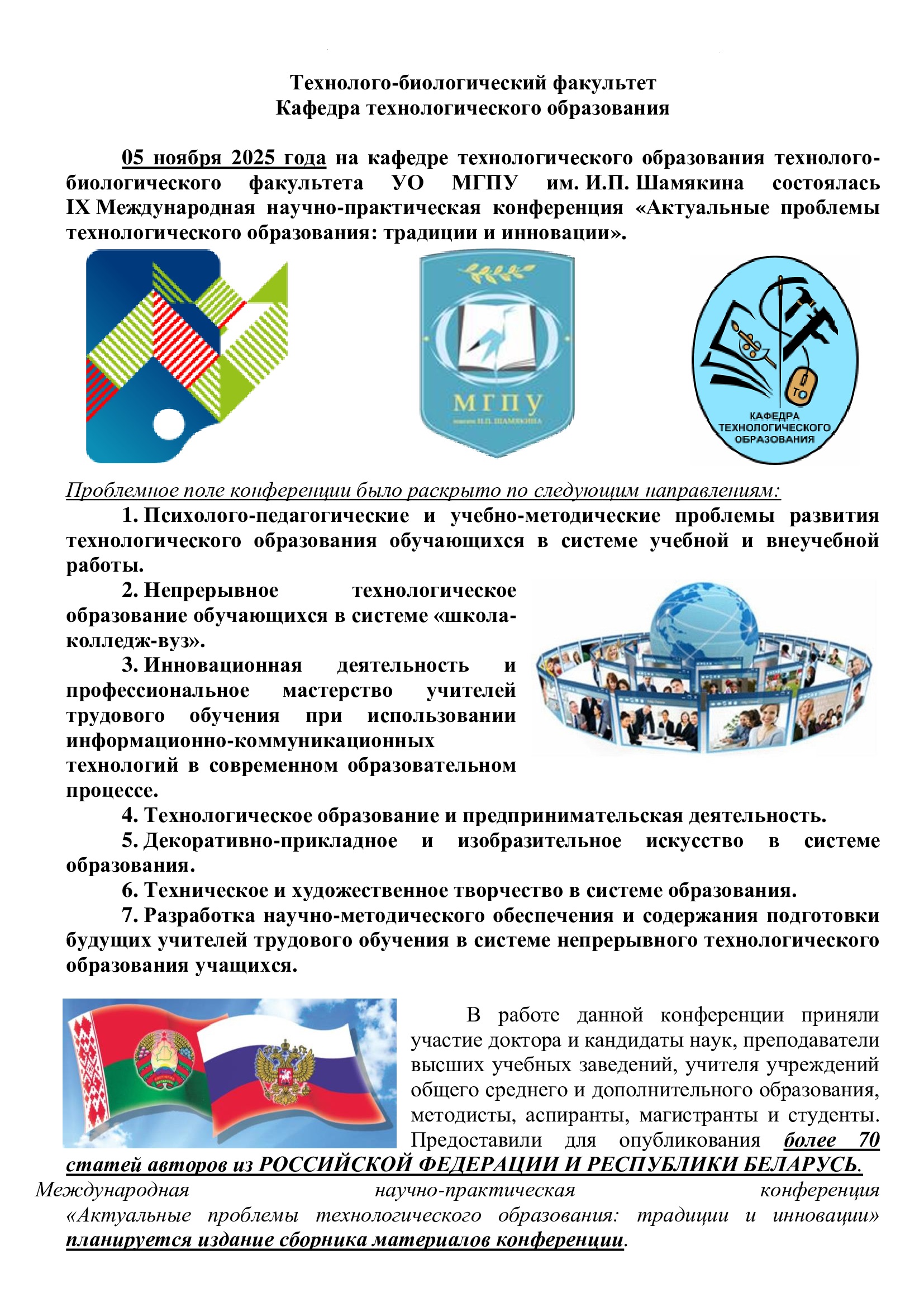 05 ноября 2025 года на кафедре технологического образования технолого-биологического факультета УО МГПУ им. И.П. Шамякина состоялась IХ Международная научно-практическая конференция «Актуальные проблемы технологического образования: традиции и инновации».