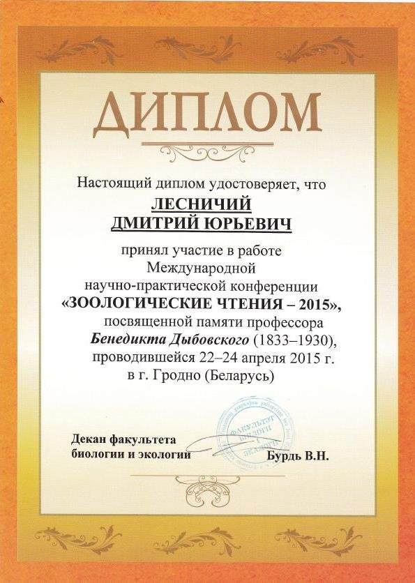 Конференция, посвященная памяти профессора Бенедикта Дыбовского (1830–1930), прошла 22–24 апреля 2015 года на базе факультета биологии и экологии Гродненского государственного университета имени Янки Купалы. На конференции УО «Мозырский государственный педагогический университет имени И.П. Шамякина» представил студент 5 курса 2 группы биологического факультета Лесничий Дмитрий.