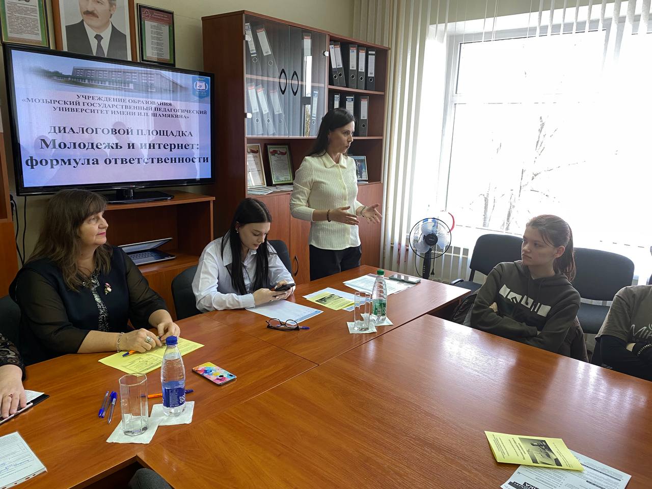 19 ноября заместителем декана по идеологической и воспитательной работе на технолого-биологическом факультете С.И.Журавлёвой была организована для студентов университета диалоговая площадка «Молодёжь и Интернет: зона ответственности» с участием инспектора ИДН ОВД Мозырского райисполкома М.А.Метельской и медицинским психологом Мозырского психоневрологического диспансера Н.Н.Лучинович.