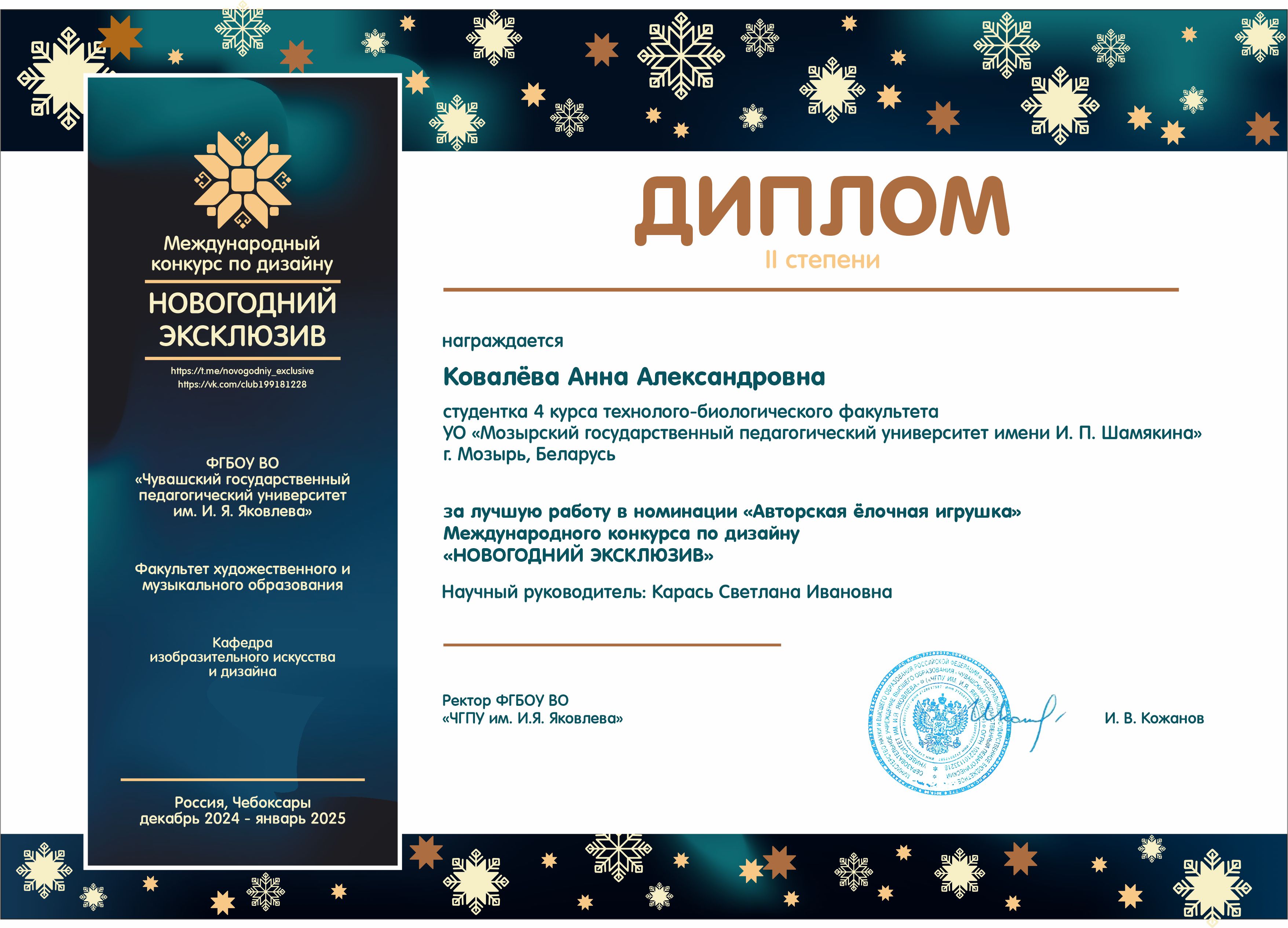 31 января 2025 года подведены итоги Международного онлайн-конкурса по дизайну «Новогодний эксклюзив». Организатором выступила кафедра изобразительного искусства и дизайна факультета художественного и музыкального образования ФГБОУ ВО «ЧГПУ им. И. Я. Яковлева» (г. Чебоксары, Чувашская Республика).